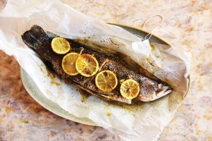 “The paperbark gives the whole barramundi a smoky taste reminiscent of the campfire. If you can’t get paperbark, this fish is still delicious when cooked in foil or baking paper. I’ve made it both ways, and by having the barramundi well wrapped in the oven, the lemon myrtle infuses into the fish perfectly.”